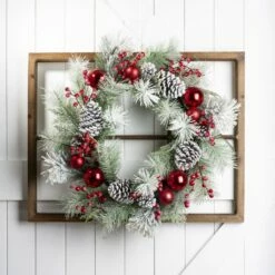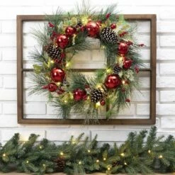Hot Sale 🎉 Glitzhome® Brown Wooden Window Frame with Pre-Lit LED Pinecone & Red Ornament Wreath 👍