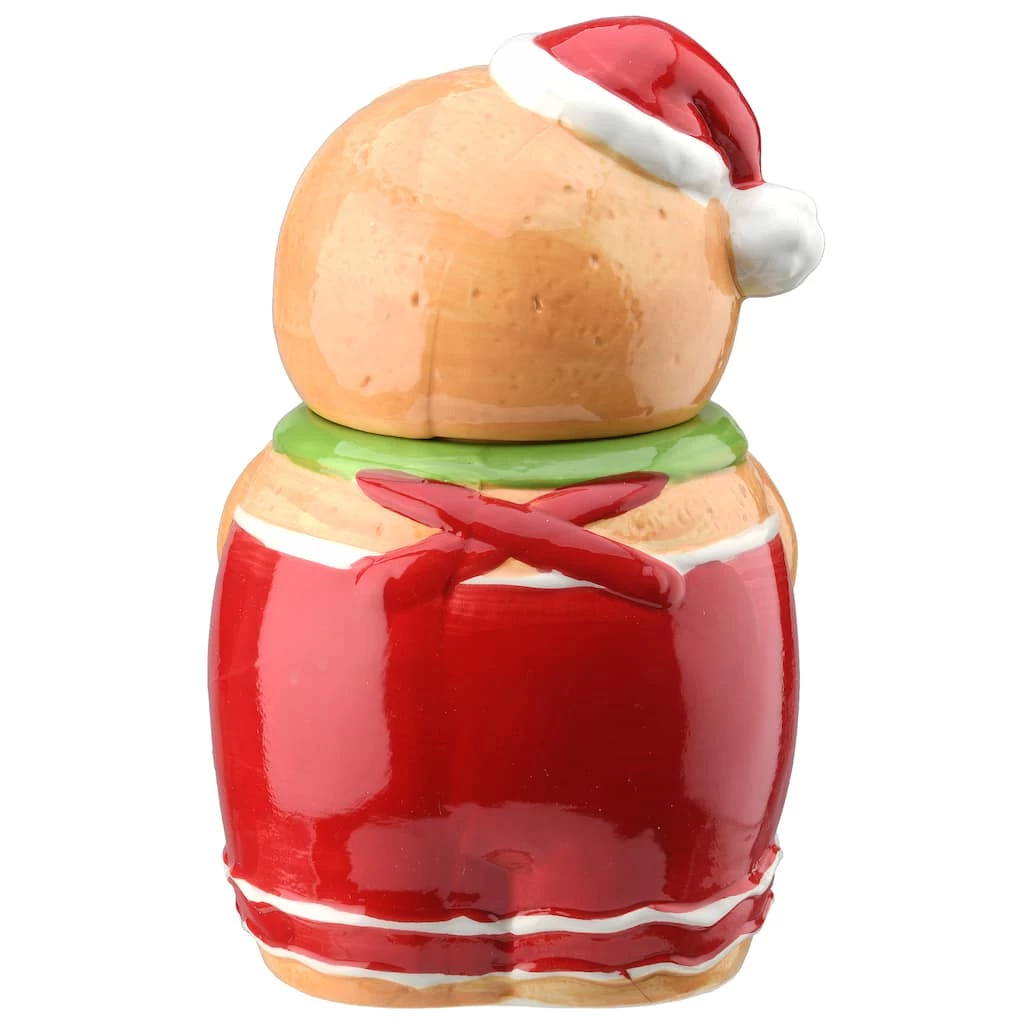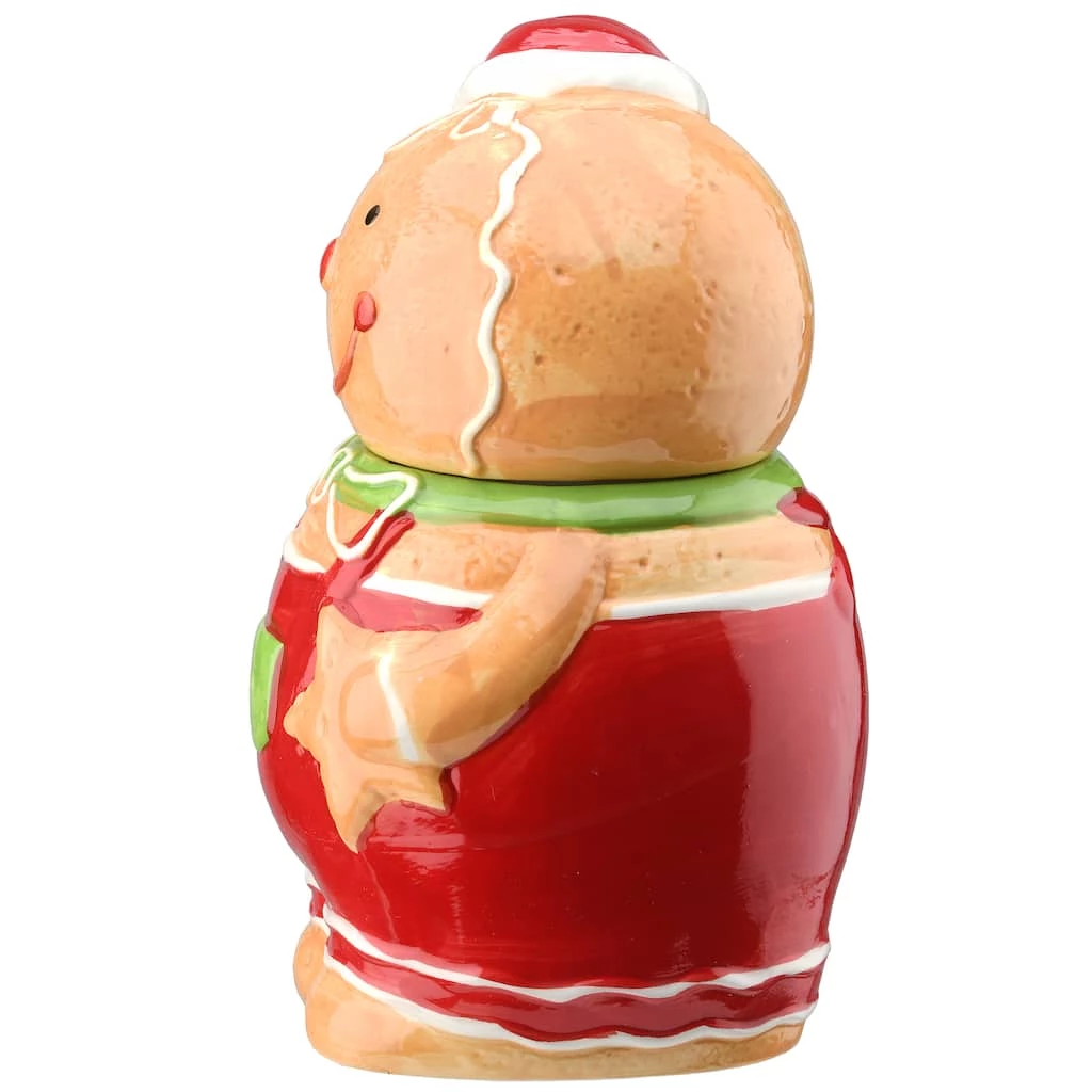 This removable top cookie jar is designed in the likeness of a Gingerbread Man, dressed in red cap and overalls. This holiday piece is hand painted ceramic material with a glazed finish. Make this cookie jar a functional part of your seasonal decorating scheme.