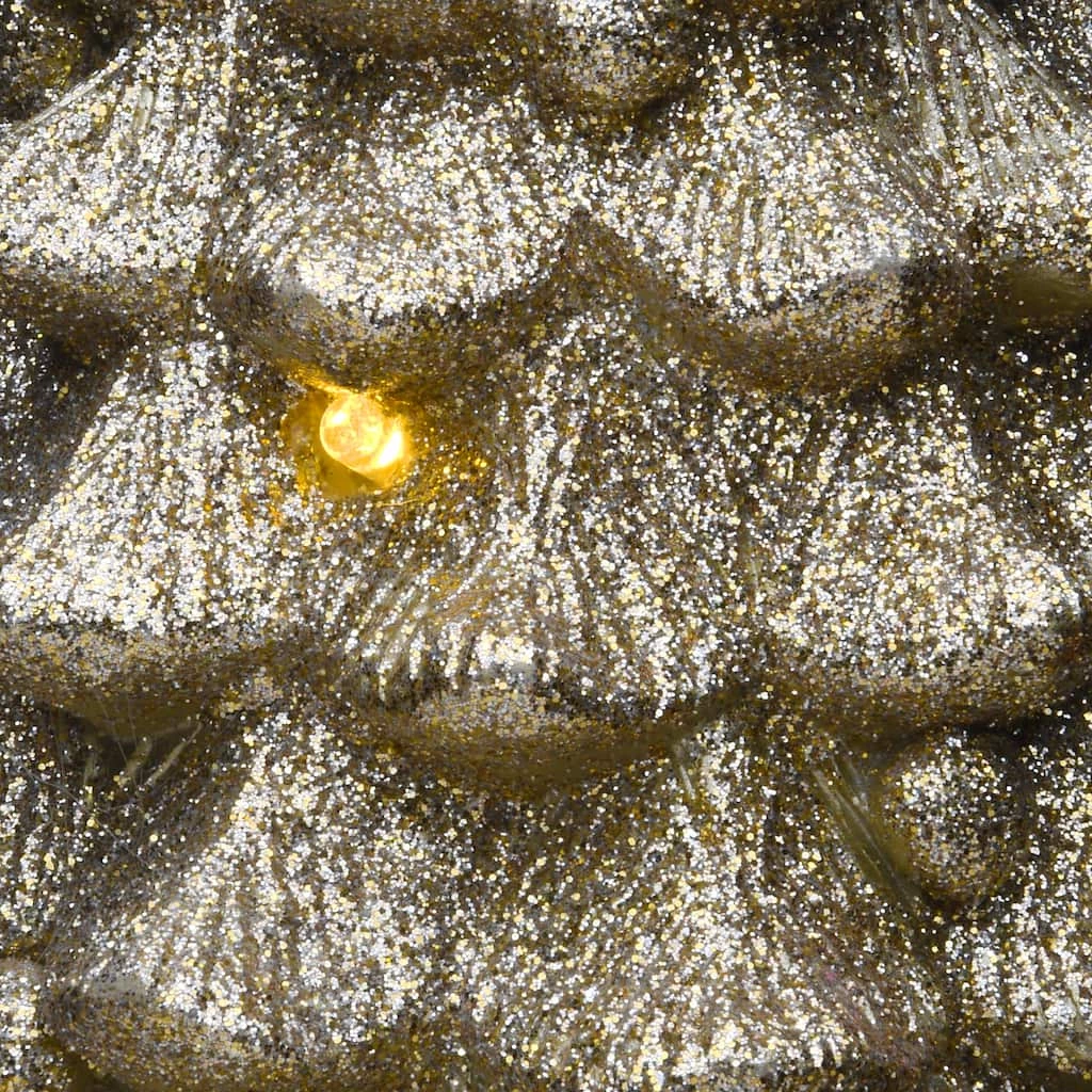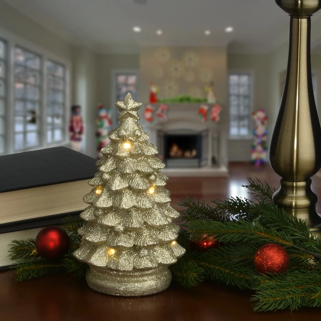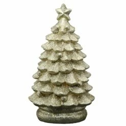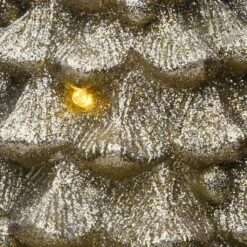 This tabletop decorative piece is constructed of sturdy yet lightweight poly-resin material. Finished in a bright gold color with a dusting of glitter, this stylized evergreen tree features warm white LED lights for added sparkle. Lights are battery operated and glow from inside creating a warm and pleasant holiday decoration.