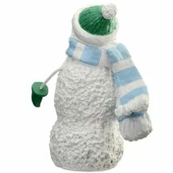 This snowman with a bright orange carrot nose is keeping warm wrapped in a thick blue and white striped scarf. A green cap and matching mittens complete the warm weather gear. This decorative piece is constructed of lightweight paper clay material with hand-painted detail. A perfect decoration for display on tabletop, shelf, or windowsill.