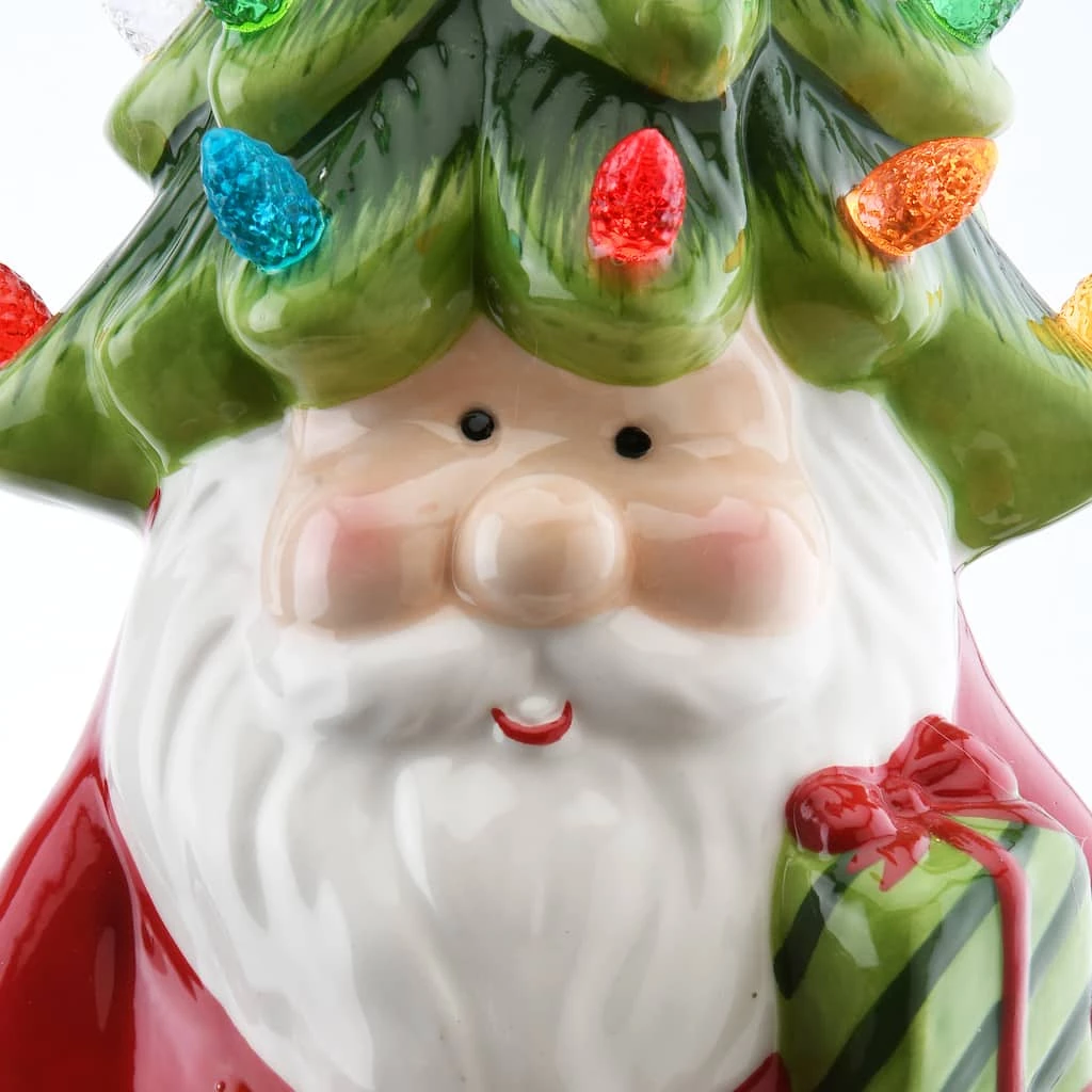 This colorful Christmas decoration is constructed of glazed ceramic featuring handcrafted sculpting and hand-painted detail. Sitting atop the head of a smiling Santa is an evergreen tree trimmed with multicolor bulbs and top star. It is lit from inside with four battery operated yellow LED bulbs glow through the lights on the tree and the star openings in Santaβs coat. This tabletop piece will be a fun addition to your holiday decorating scheme.