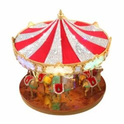 The Swarovski holiday carousel from Mr. Christmas is the glamorous holiday centerpiece your collection is missing. A smiling Santa in his sleigh waves while his adorable reindeer rise and fall as the carousel turns. 32 LED lights illuminate through the multicolored panels and over 1,000 Swarovski crystals decorate the roof and animals creating a dazzling display as the carousel rotates. This adaptor-operated carousel plays 25 of your favorite Christmas carols, and built-in volume control allows you to enjoy with or without music.