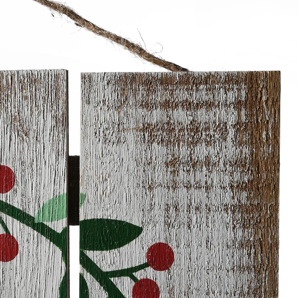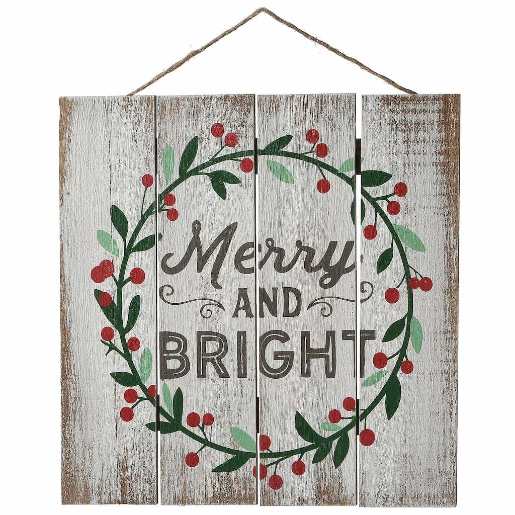 Welcome visitors during the Christmas holiday with this seasonal sentiment with a rustic flair. It is constructed of lightweight wood slats painted in a distressed white finish. βMerry and Bright” is printed inside a wreath of red berries and green leaves. Display this decorative holiday trimming in indoor or covered outdoor locations.Β