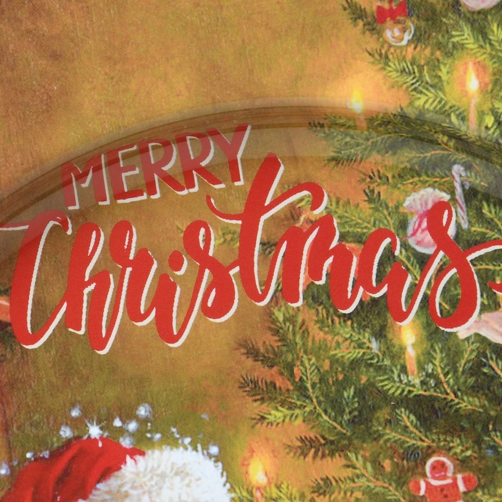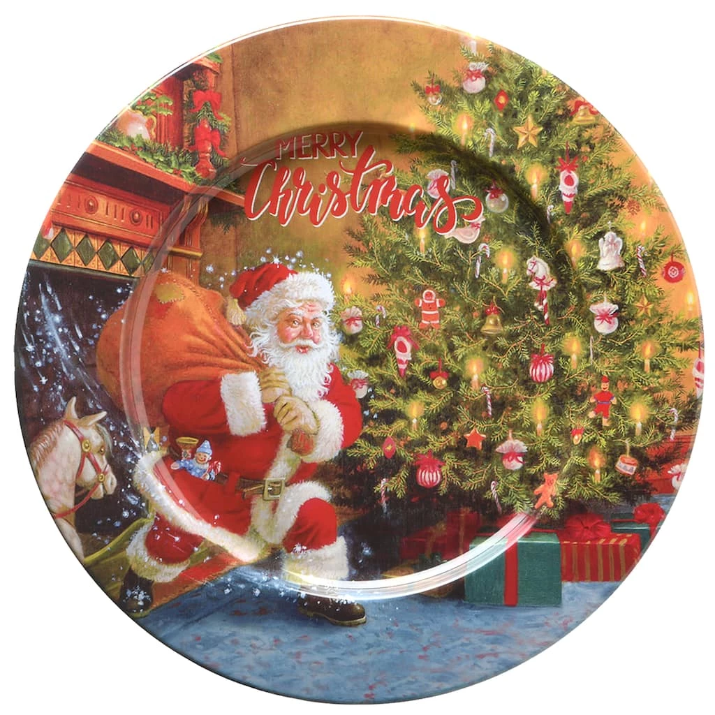These chargers are constructed of metal for strength and durability and designed for easy stacking. Each is painted with a whimsical and beautifully detailed image of Santa coming from down the chimney, toy sack in hand in front of a decorated tree. βMerry Christmas” is written in and red and white lettering. These chargers are perfect for service at holiday gatherings or parties.