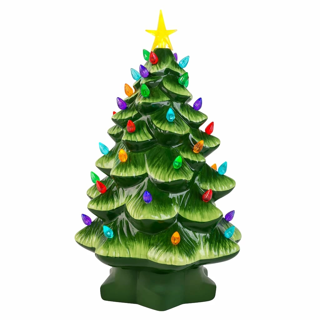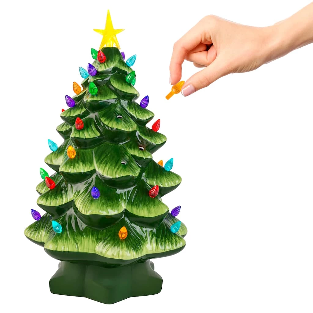 Bring back memories from past Christmases with this vintage-inspired ceramic 14″ Nostalgic Christmas Tree. This classic Christmas accent has been a focal point of households for generations, and is now available with modern technology. LED lights radiate through the faceted bulbs, and a bright yellow star illuminates the top of the tree with a shiny polished green finish. This tree looks great on the mantel, side table, bedroom, bookshelf, or anywhere that needs a festive touch.