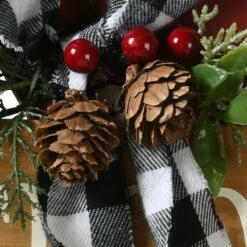 This attractive wall piece is constructed of lightweight wood composite material featuring red and white painted candy canes and βWelcome” printed on a natural finish wood sign. It is trimmed with evergreen branches, red berries, pinecones and a plaid fabric ribbon and bow . Display this decorative holiday trimming in indoor or covered outdoor locations.Β