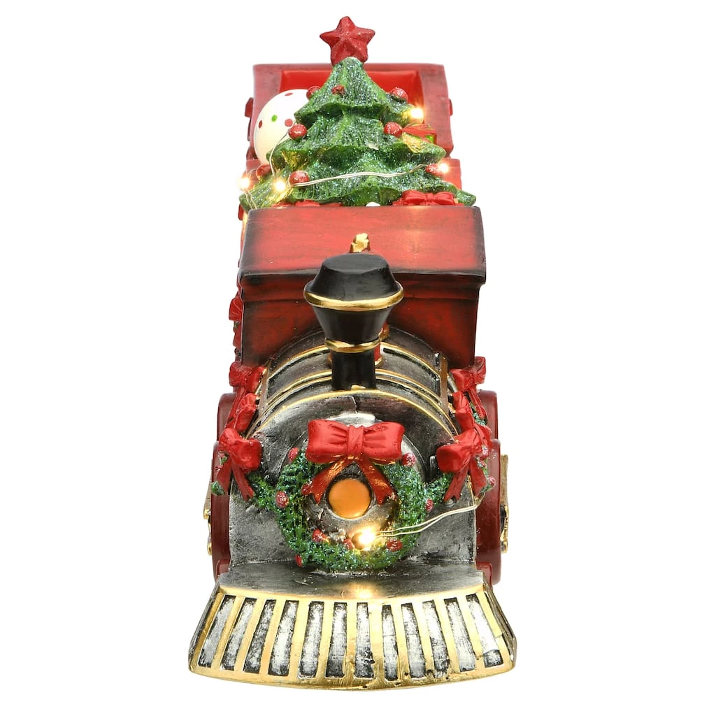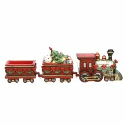 Train cab and both cars are finished in a bright red and all are trimmed in green garland. One car is overflowing with wrapped gifts and a decorated tree. A string of battery powered white LED lights wrap around train engine and first car adding soft illumination.
