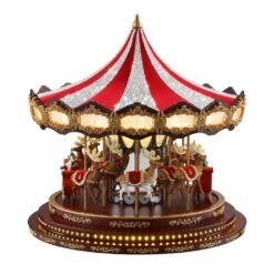 The Swarovski Grand Carousel from Mr. Christmas shimmers and shines, creating an eye-catching magical display. A smiling Santa in his sleigh waves while his adorable reindeer rise and fall as the carousel turns. 136 LED lights illuminate the carousel’s marquee, base, and center panels and almost 4,000 Swarovski crystals decorate the roof and animals creating a dazzling display as the carousel rotates. This adaptor-operated carousel plays 20 of your favorite Christmas carols, and a built-in volume control allows you to enjoy with or without music.