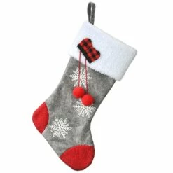 Combining fashion and function, this attractive Christmas stocking is deep and wide, allowing Santa to fill it with lots of goodies. This seasonal sock is a warm gray color with red heel and toe accents, and a motif of ornate white snowflakes. From the bright white cuff, two pom-poms on strings fall from little plaid mittens. Constructed of strong polyester materials designed for years of holiday cheer.