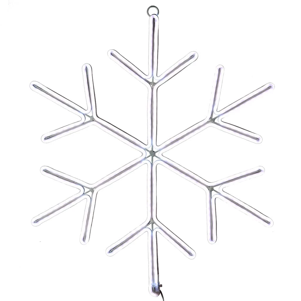 This decoration is constructed with a rigid white metal center frame that is wrapped in tubing with 456 mini lights. The lights create a white glow similar to neon. Both sides of the snowflake light up which makes it a great decoration for hanging on a window, as well as on a door or wall.