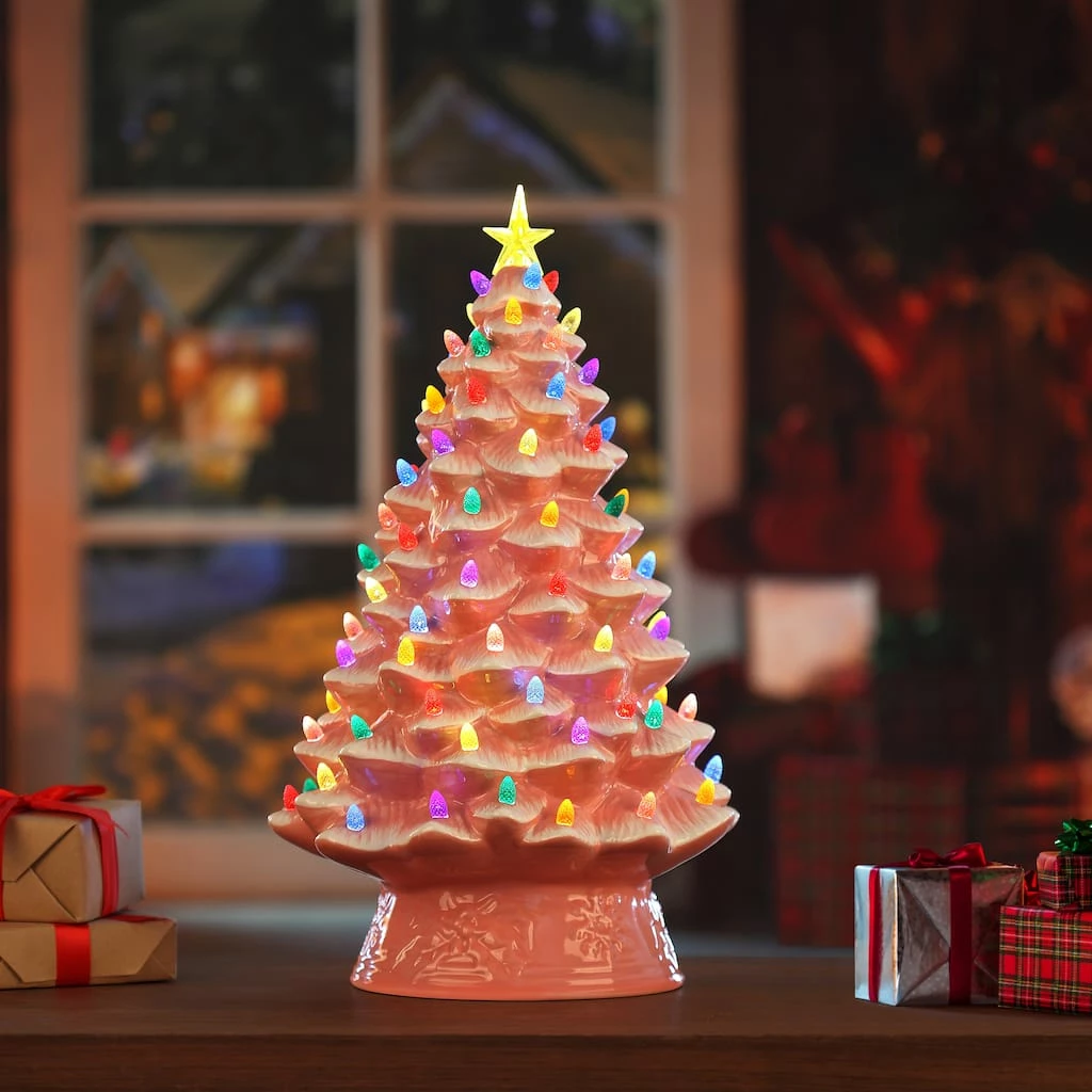 Bring back memories from Christmas’ past with this vintage-inspired pink ceramic 18″ Nostalgic Christmas Tree by Mr. Christmas. This classic Christmas decoration has been a focal point of households for generations, now available with modern technology. LED lights radiate through the faceted bulbs, and a bright yellow star illuminates the top of the 18″ tree with a shiny polished pink finish. This classic holiday dΓ©cor item is adapter operated and easy to setup. This tree looks great on the mantle, side table, bedroom, bookshelf, or anywhere that needs a festive touch. The Mr. Christmas Nostalgic Christmas Tree makes the perfect gift for your loved ones or yourself, especially if you can’t make it home for the holidays.