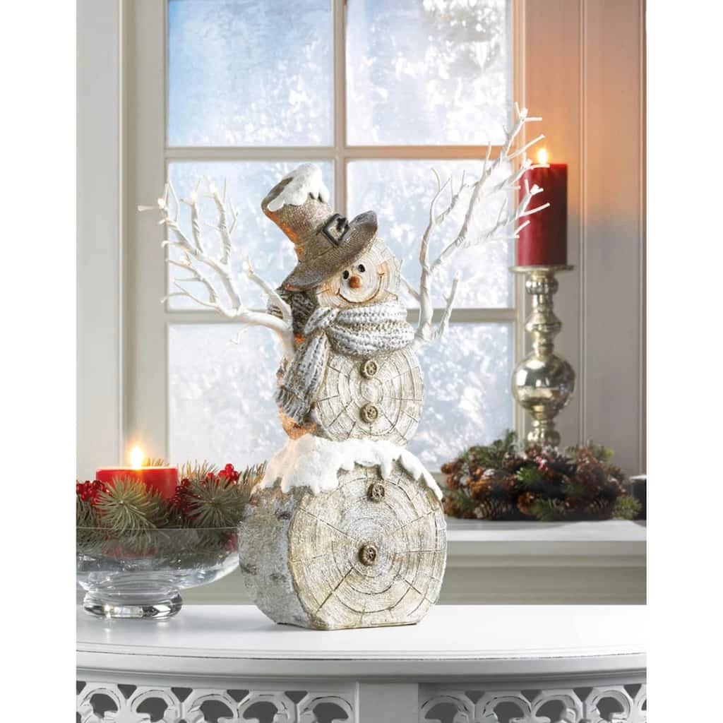 Made of durable plastic, polyresin, and a solar panel to create a beautifully detailed sculpture. Fill your home with holiday cheer with this seasonal statue! Adds a touch of winter whimsy to any space in your home from a fireplace mantel, Christmas centerpiece, shelf dΓ©cor and more. To clean your statue, dust lightly or wipe with a damp cloth as needed. Bring on winter with fun dΓ©cor pieces like this adorable snowman statue. This snowman figurine features a rustic design with a birch tree body and twig arms with LED lights. A festive seasonal piece, this decorative tree trunk snowman will make you smile throughout the entire winter season.