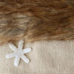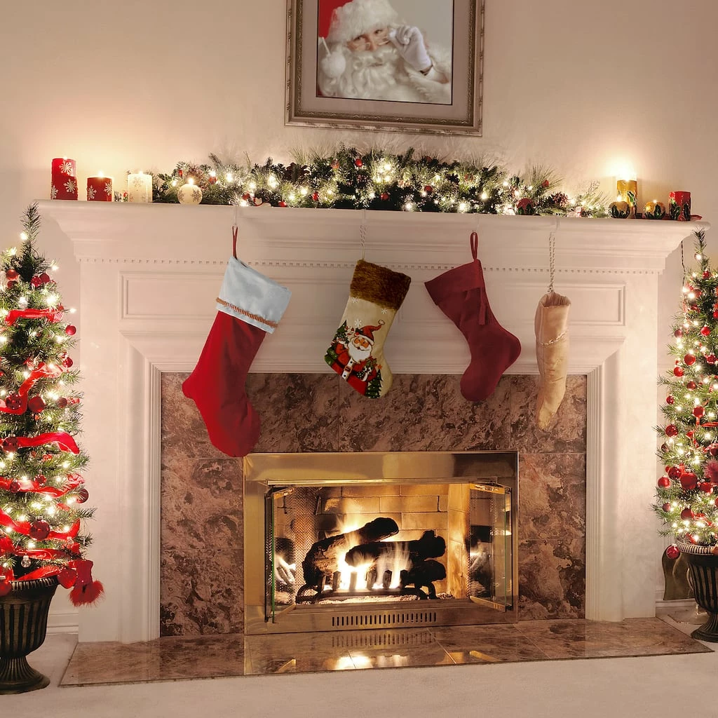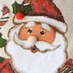 This screen-printed Christmas stocking topped with a soft faux fur cuff, is deep and wide allowing it to be filled with lots of holiday goodies. In bright red and green colors, this stocking features an image of Santa Claus with a candy cane in one hand and wrapped gifts in the other. In the background are evergreen trees with their branches dusted with snow. Constructed of strong polyester materials designed for years of Christmas cheer.