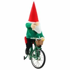 This oversized animated cycling gnome from Mr. Christmas is ready to ride into your home and hearts. This adorable gnome is dressed in his finest red hat and plush green fabric outfit accessorized with his big white beard. The gnome pedals his jolly green bike for approximately 45 seconds when turned on and you can even turn the front wheel to make him circle your Christmas tree. The bicycle basket holds presents and an LED illuminated sisal tree with a star topper. With a built-in speaker, the cycling gnome plays 24 Christmas carols.