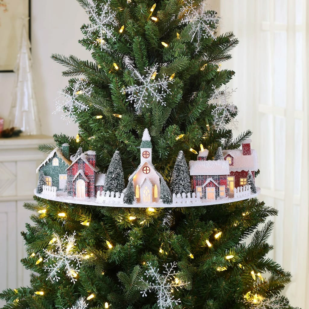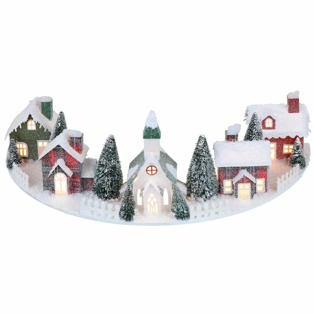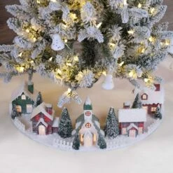You can now display your favorite holiday decoration front and center. This illuminated village scene circles the front of your Christmas Tree. Easily connect to your tree or lay at the base in place of a tree skirt. At 24″ long, this holiday decoration is designed to fit most artificial or real Christmas trees. The village is battery-operated, so there are no messy cords to worry about. This unique decorative village will bring style to your home this Christmas with red plaid facades and snowy accents.
