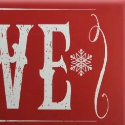This all-metal holiday sign features a bright red background that reads βBELIEVE” in a weathered white vintage style text. Surrounding the message are ornate embellishments including decorative snowflakes. Sign has rounded corners and is raised out from its white edges. Backside mounting loops are included in each top corner.