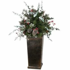 This attractive and unique evergreen decoration is perfect for displaying in doorways, hallways, porches and patios. It is pre-lit with 50 warm white LED lights and trimmed with red berries, pinecones, and leafy silver stalks. A tall, elegant and sturdy painted poly-resin base completes this holiday-themed floor planting. For display in indoor or outdoor locations.