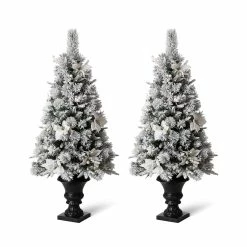 This set of mixed pine porch trees with decorative urn base is a welcoming addition to doorway, deck, porch or patio. It features snow sprinkled branches and is trimmed with white berries, Poinsettia and holly leaves. This tree is pre-lit with warm white lights that remain lit even if a bulb burns out. Display this attractive greenery in any indoor or covered outdoor location.
