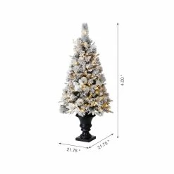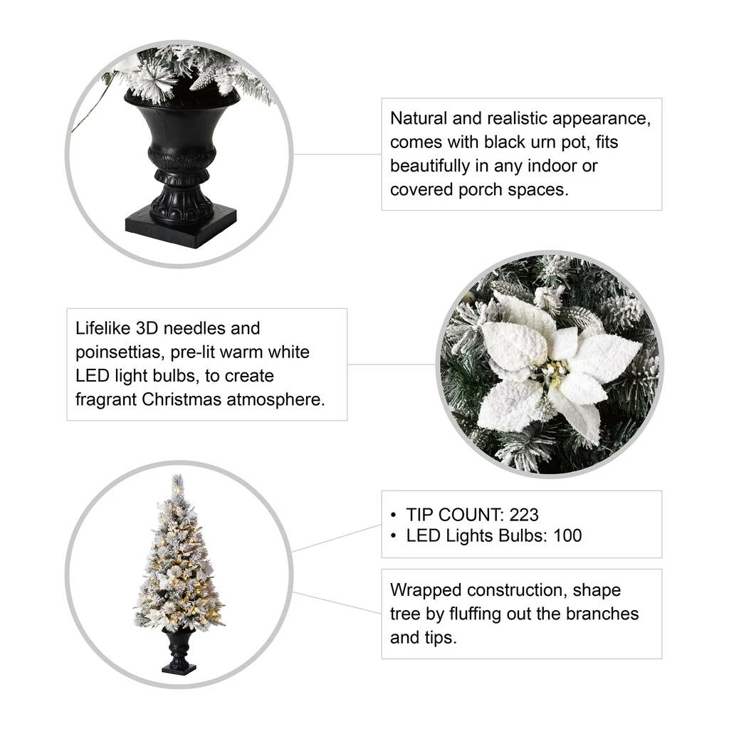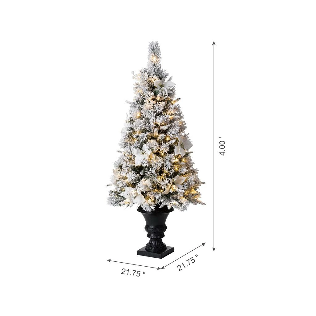 This mixed pine porch tree with decorative urn base is a welcoming addition to doorway, deck, porch or patio. It features snow sprinkled branches and is trimmed with white berries, Poinsettia and holly leaves. This tree is pre-lit with warm white lights that remain lit even if a bulb burns out. Display this attractive greenery in any indoor or covered outdoor location.