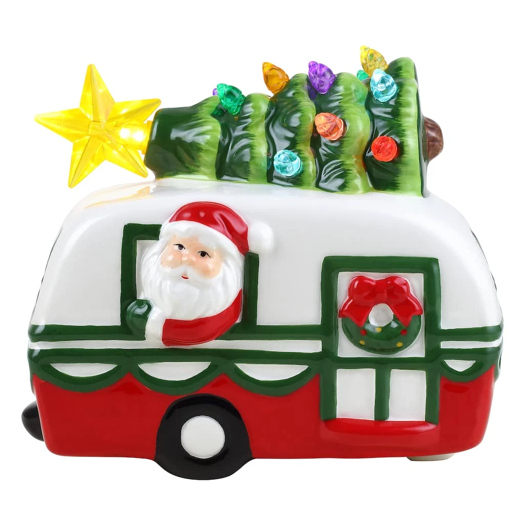 Bring the wonder of the great outdoors to your home with Santa’s ceramic camper from Mr. Christmas, a beautiful vintage-inspired red and white camper topped with a nostalgic tree illuminated with LED multicolored lights and a yellow star on top. With hand-painted details and a jolly Santa behind the wheel, this camper is ready to camp out all season long on your mantel, table or windowsill. No matter where you place this vehicle, it will let your guests know you are one happy camper.