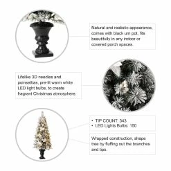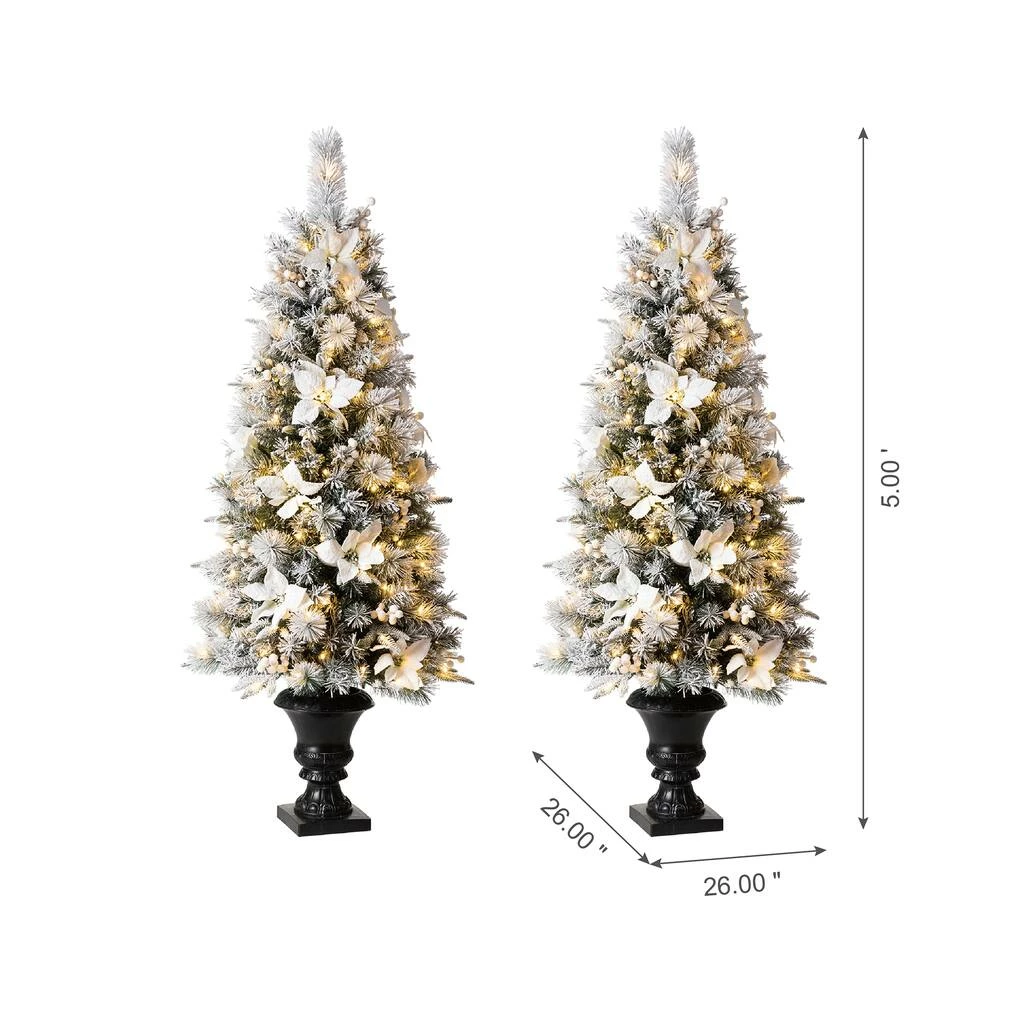 This set of mixed tip pine porch trees with decorative urn base is a welcoming addition to doorway, deck, porch or patio. It features snow sprinkled branches and is trimmed with white berries, Poinsettia and holly leaves. This tree is pre-lit with warm white lights that remain lit even if a bulb burns out. Display this attractive greenery in any indoor or covered outdoor location.