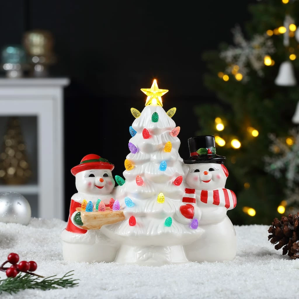 Bring back memories from Christmas’ past with the vintage-inspired Snowman and Mrs. Snowman Deck the Halls Tree by Mr. Christmas. Snowman and Mrs. Snowman are decorating their tree with multi-colored lights. LED lights radiate through the faceted bulbs, and a bright yellow star illuminates the top of the 9.25″ tree with a shiny polished green finish. A four-hour timer saves battery life and makes the tree a perfect nightlight. Operates on AA batteries (not included), no cords to worry about, and easy setup. This tree looks great on the mantle, side table, bedroom, bookshelf, or anywhere that needs a festive touch. The Snowman and Mrs. Snowman Deck the Halls Tree makes the perfect gift for your loved ones or yourself, especially if you can’t make it home for the Holidays.