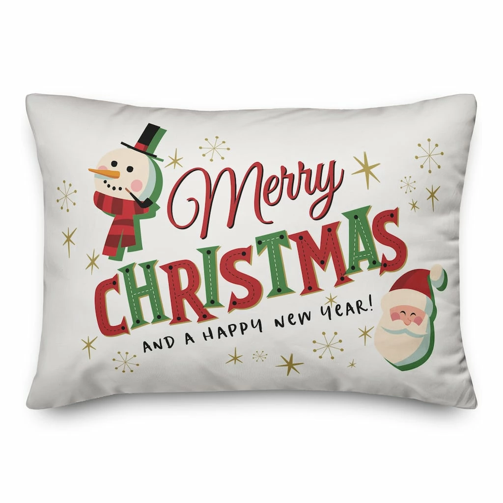 This polyester pillow features the greeting “Merry Christmas and a Happy New Year!” with a cheerful snowman and Santa to add a touch of holiday cheer to your home.