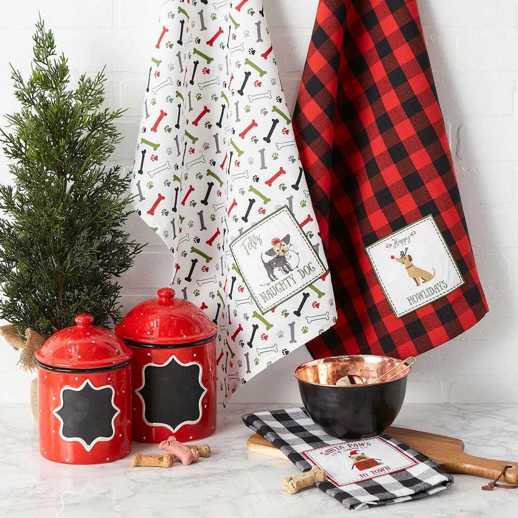 This Christmas puppy dishtowel set can coordinate with most kitchen dรฉcor to add color and joy. These easy care dishtowels are festive, fun and can tackle any mess made.