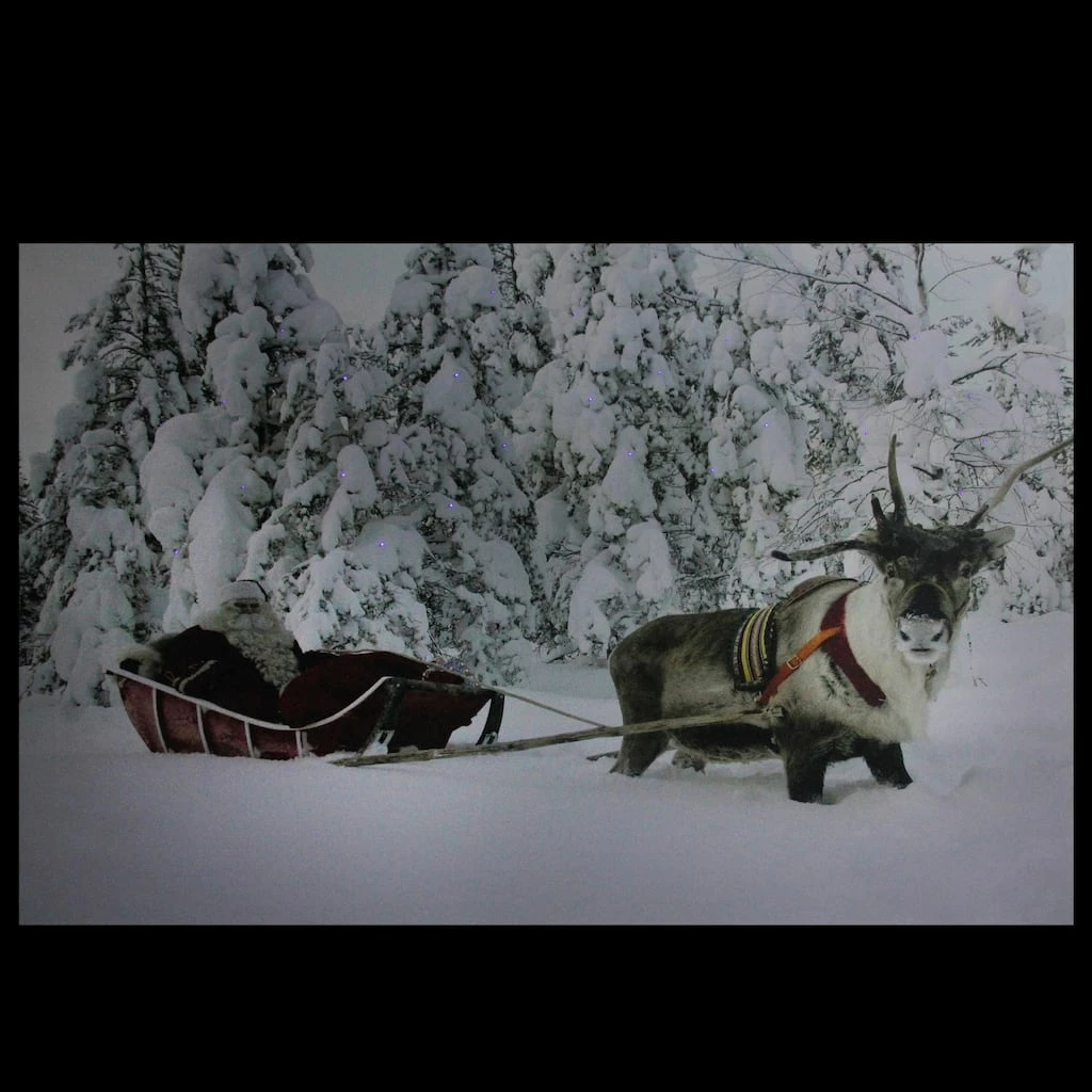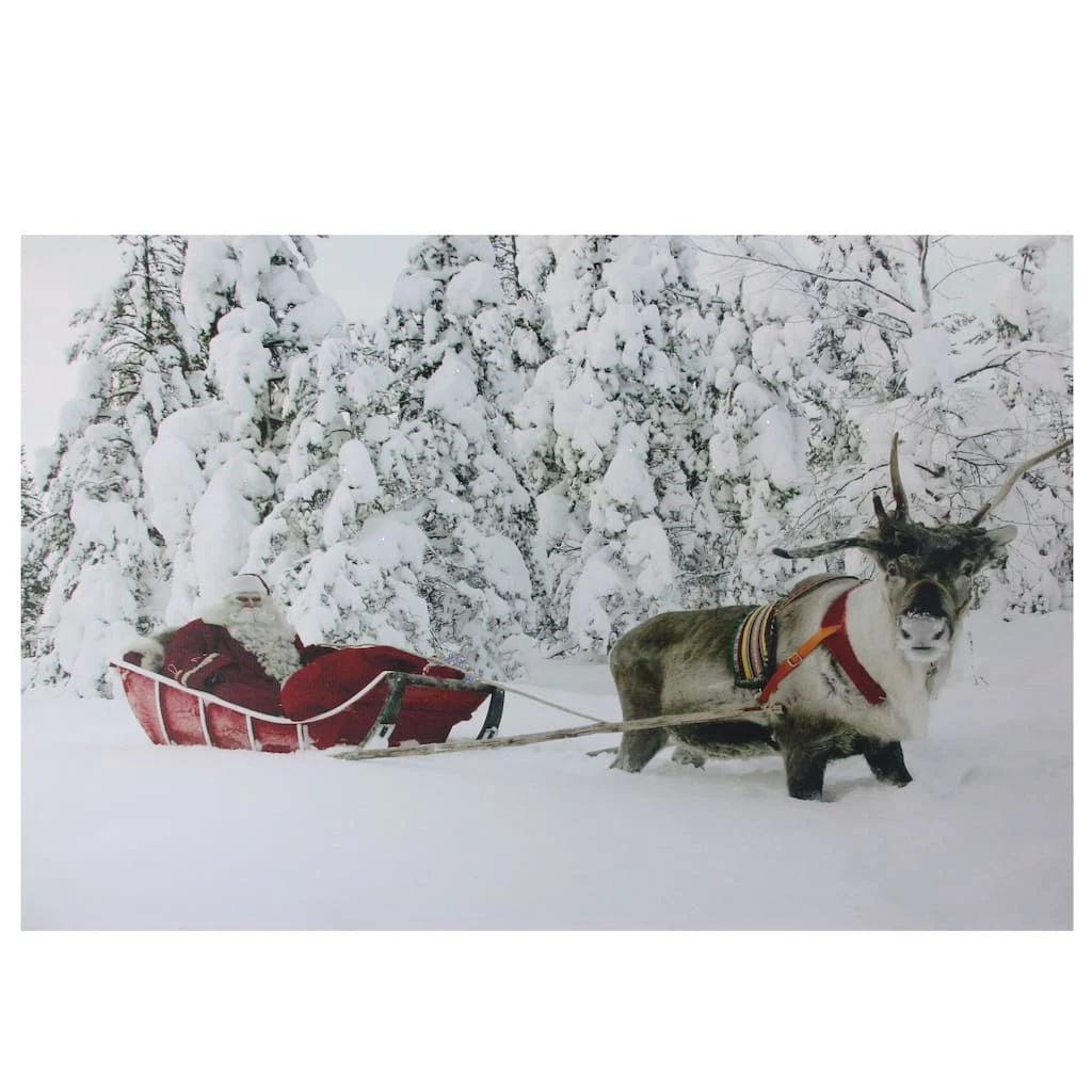 Canvas features Santa being pulled in his sleigh by one og his faithful reindeer. Pre-lit with 25 color changing fiber optic lights scattered around the trees. Colors change from red, green, blue, white and pink. Note: Item does not come with a battery cover – open design holds the batteries snugly