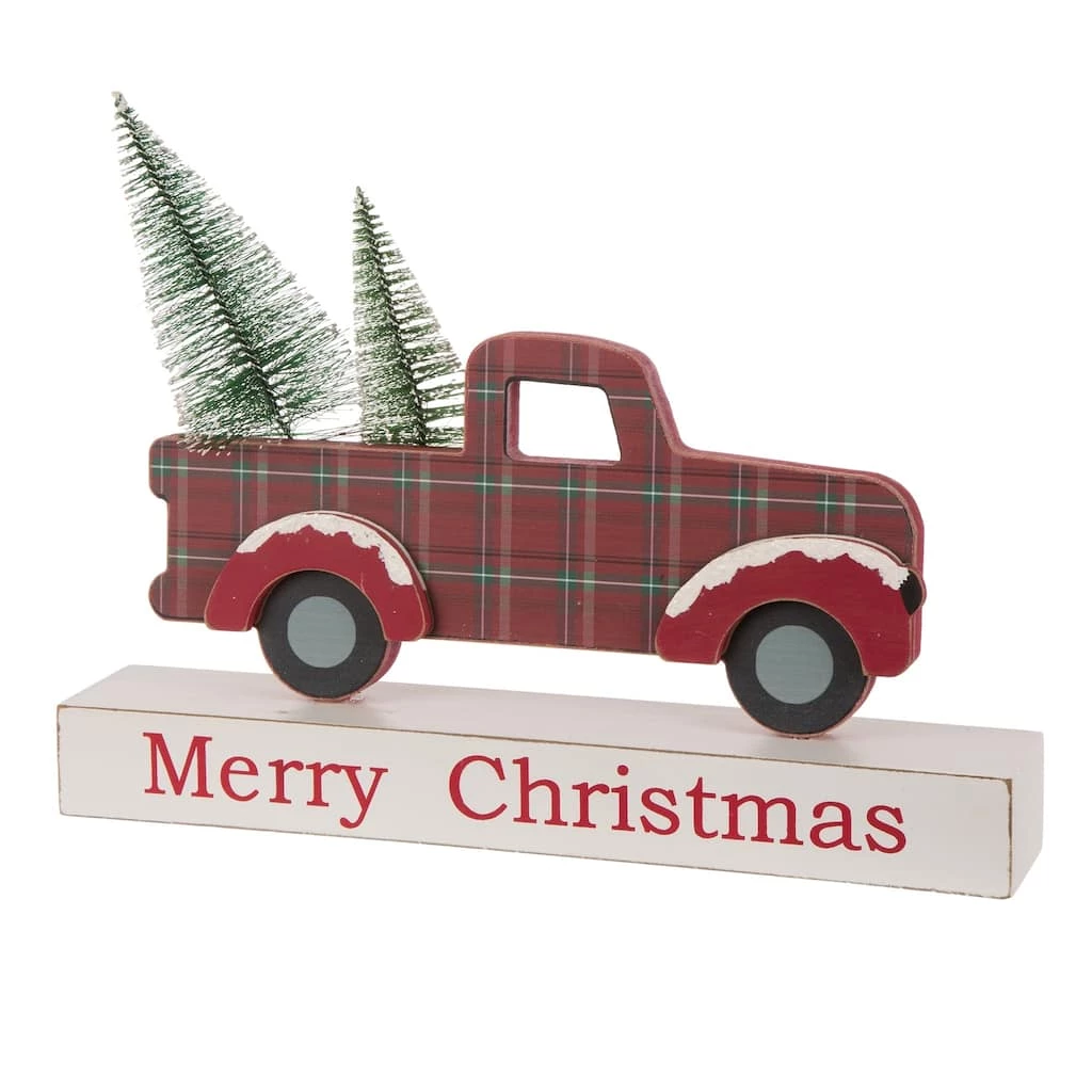 Displaying the message “Merry Christmas” in bold red letters on base, this pickup truck accent piece features holiday colors of red and green plaid with traditional Christmas trees in tow.