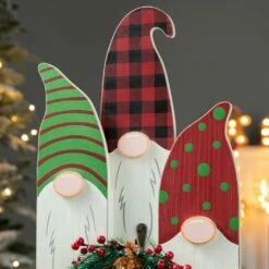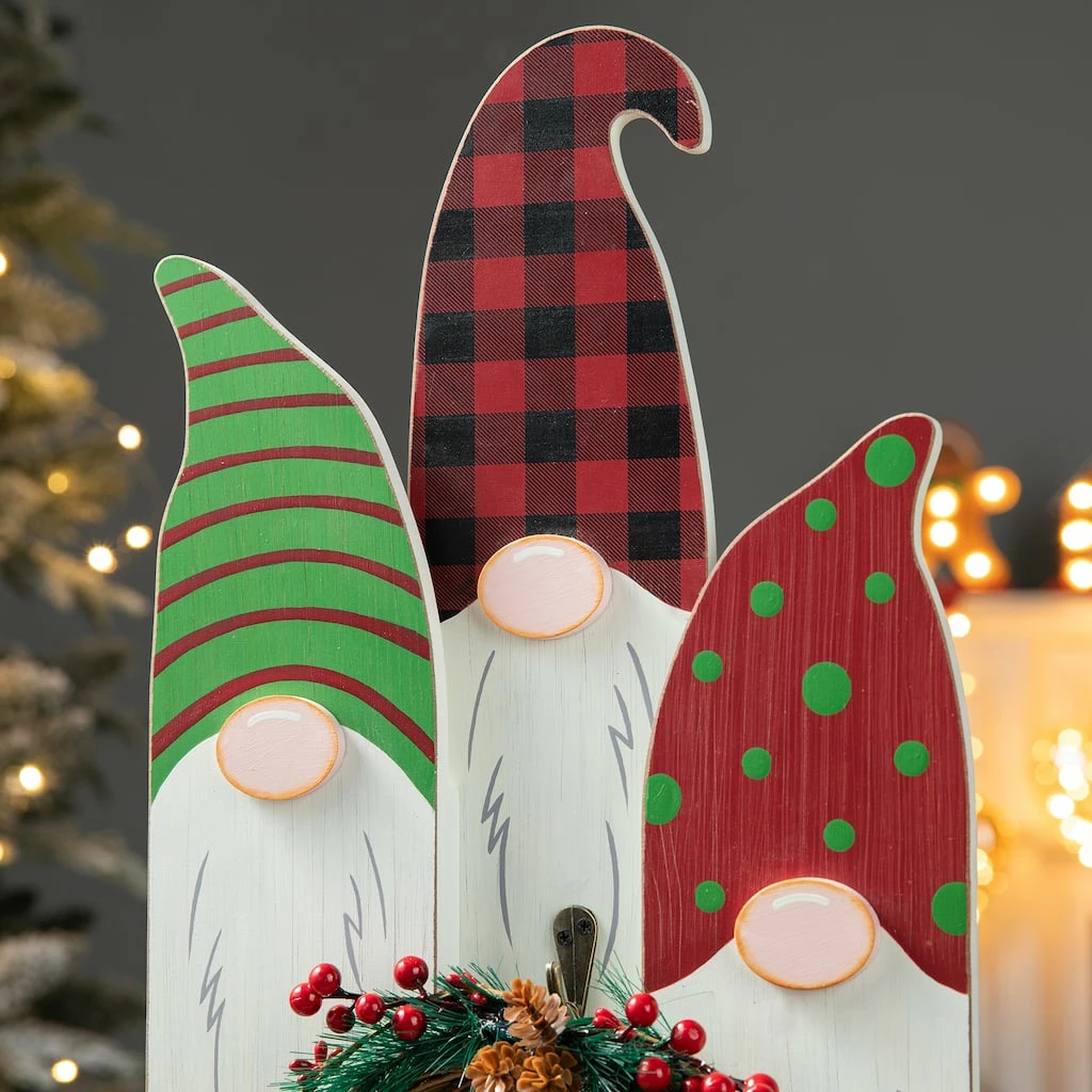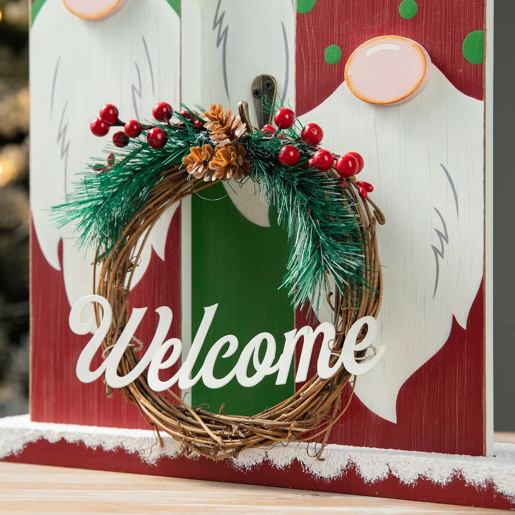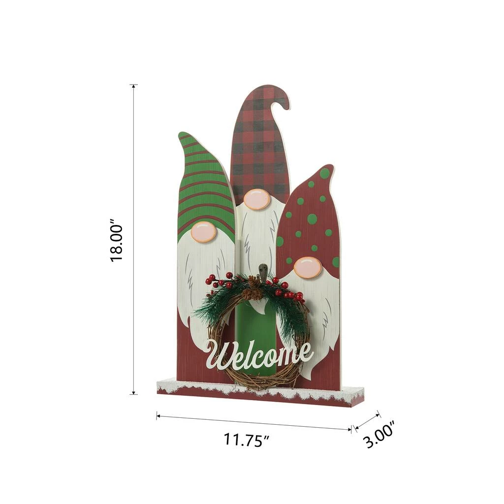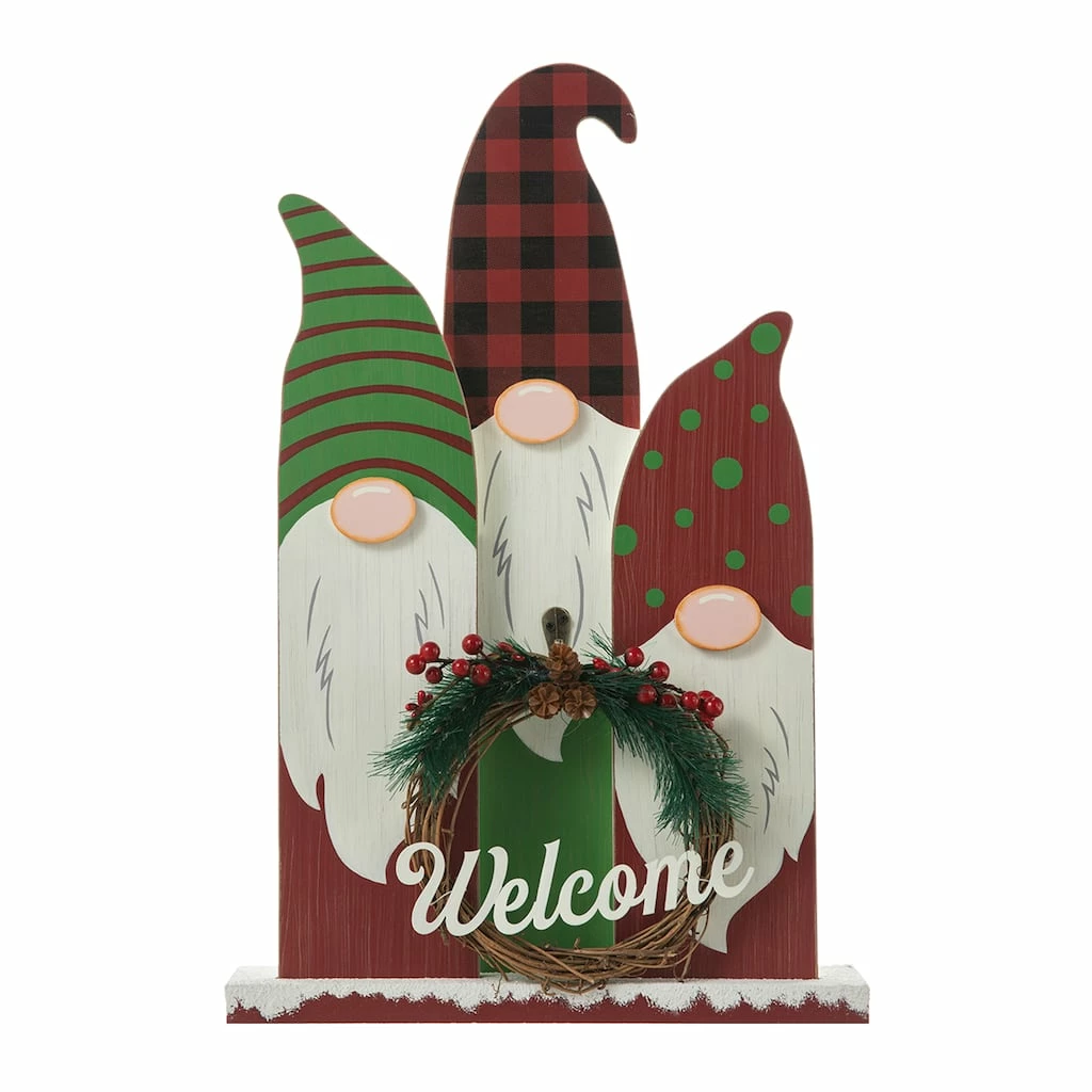 This set of gnome family table dΓ©cor is sure to complement your holiday theme! It features a ”Welcome” wreath on the front and is constructed with MDF, making it lightweight, but durable. Place it on an entryway table, shelf, countertop, of desk to add some festivity to your home. This gnome family table dΓ©cor will also make a great gift item to your loved ones.
