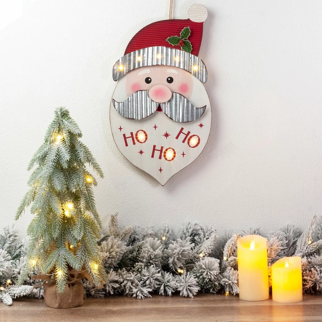Light up the holidays with this lighted 3D Santa wall dΓ©cor. The cute Santa is decorated with corrugated iron sheet and words “HO HO HO” is printed on the hat. It is decorated with warm yellow light.