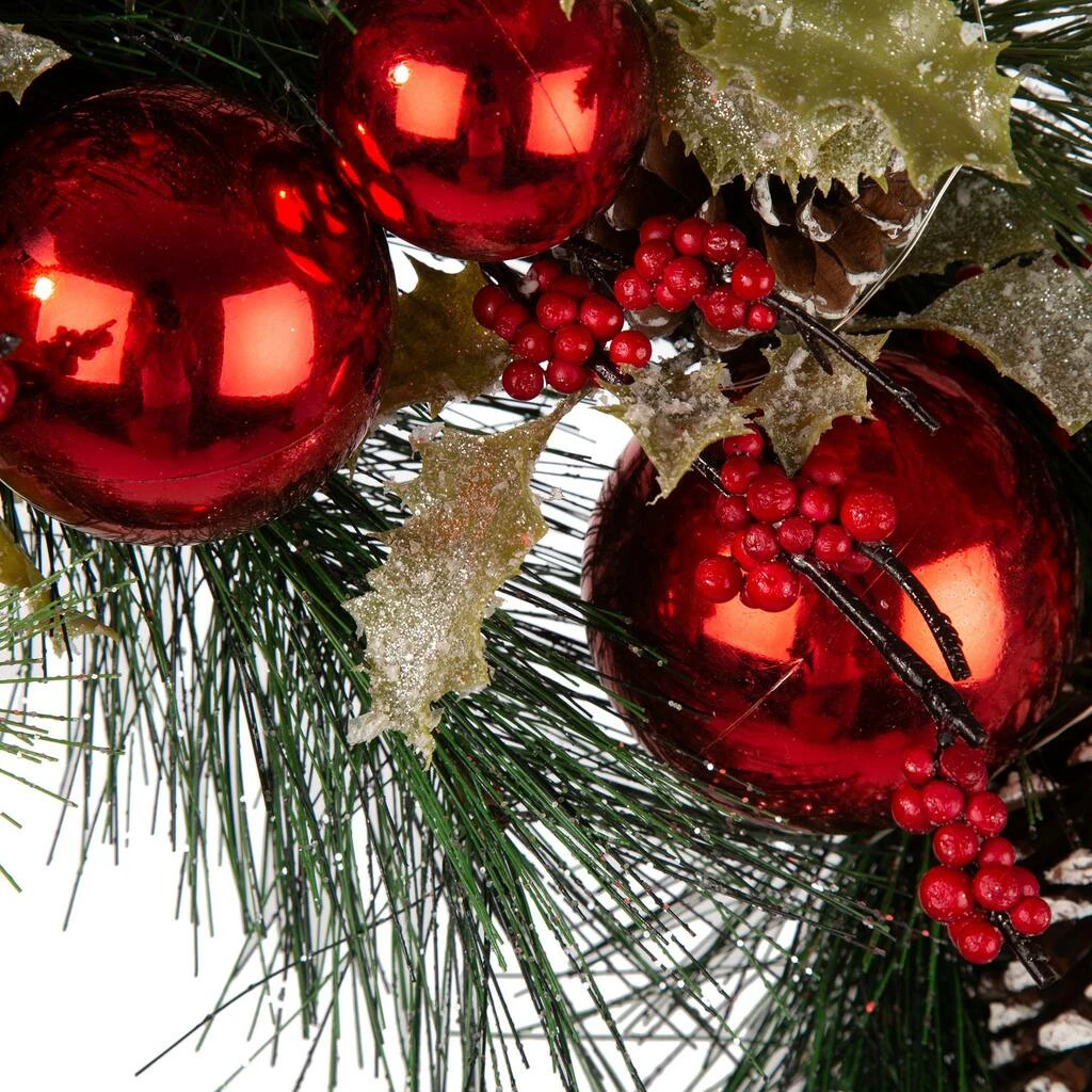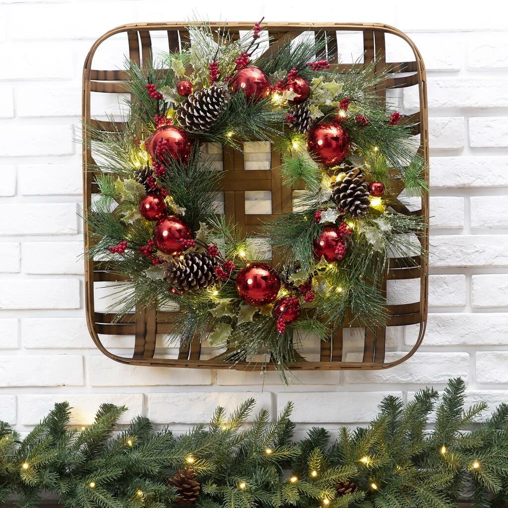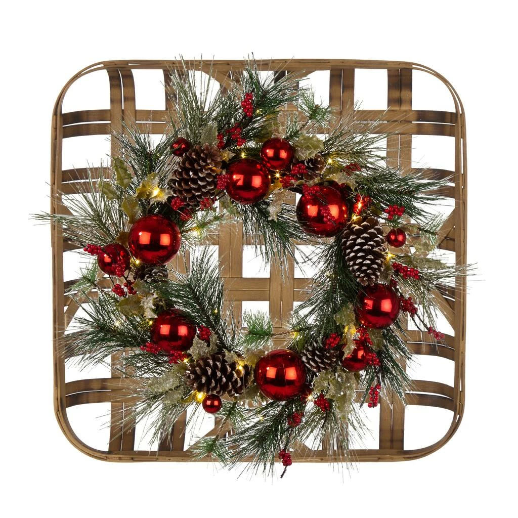 Adorn your home with lots of holiday style! This Christmas mix basket wreath features a grapevine base adorned with glittered greenery including a mix of red ornaments and pinecones, giving your holiday a festive feel. Affixed to the back is a wooden woven basket that gives this piece a holiday-inspired feel. It’s perfect for decorating your front door or for use as an entryway feature to greet you guests this holiday!