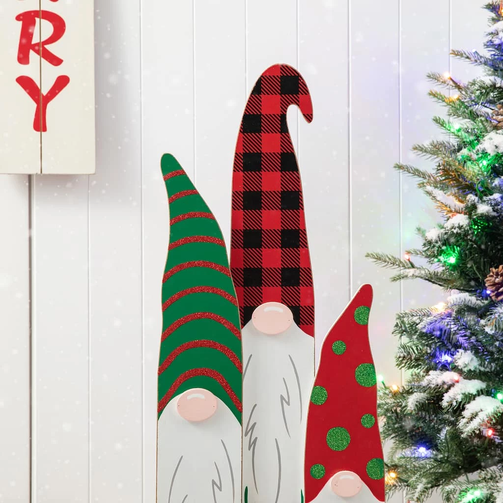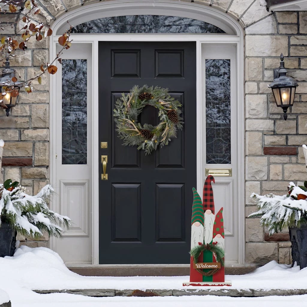 This charming Gnome family porch dΓ©cor will make a great addition to your holiday theme. It features the word “Welcome” with a rattan wreath in front of baby gnome. This piece can be displayed as one porch decoration or detached into three separate items for multiple decorations. Made of durable wood, the family design gives a festival atmosphere.