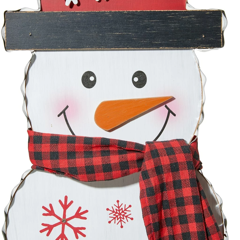 To celebrate and decorate your holiday with this snowman porch sign. It features a cute snowman wearing plaid scarf, with curved body and black hat, adorned with white snowflake and holiday sentiments of beautiful font. It’s a perfect accent to place outside and near an entryway door. Seasonal sentiments and designs serve as an inspiring way to greet family and friends.
