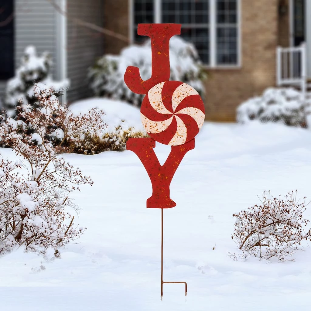 Our rusty metal Christmas “joy” yard stake signs are made of powder-coated metal and feature an “h” base stake that goes 4″ into the ground for a secure hold. The yard stake can be used outdoors. Christmas lawn dΓ©cor can be displayed in wind, snow and rain without any worry. Display nicely in our garden stake.