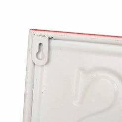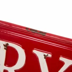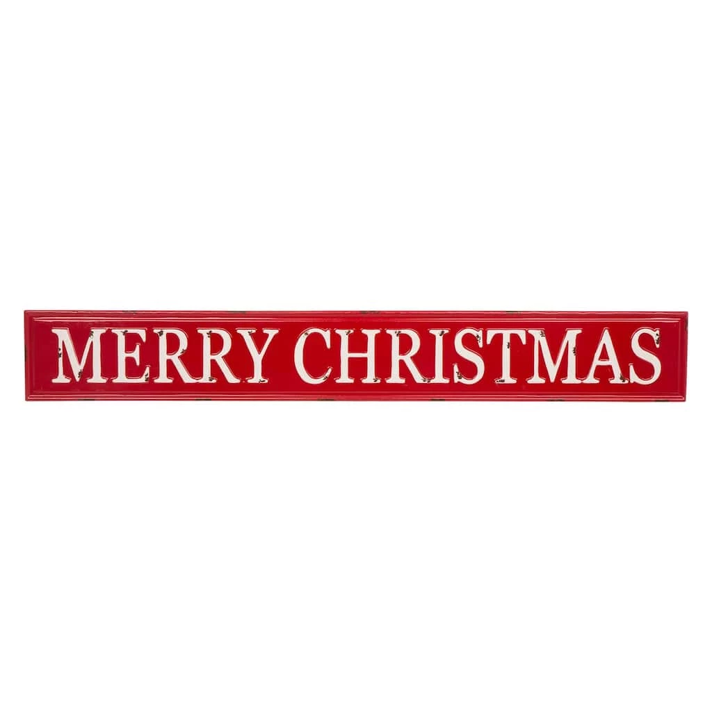 This is a handmade, distressed, Christmas sign that says, “Merry Christmas” in script lettering, painted in red with white lettering.ย