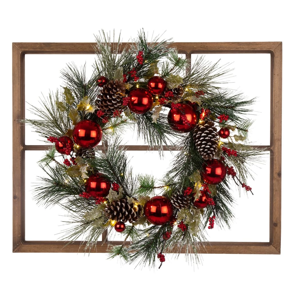 Empty entryway wall? Some spare space in the master suite? A boring bathroom? Wall art instantly turns any blank area into an eye-catching display, all while lending gallery-worthy appeal to your abode. Crafted from wood, this rustic window frame supports a Christmas wreath with pinecones and red ornaments.