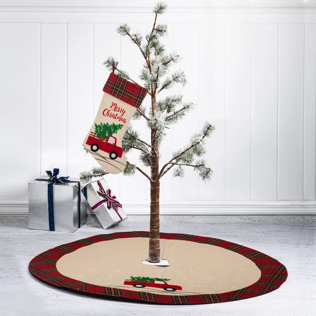 Decorate your home for Christmas with this matching stocking and tree skirt. Hang the stocking on your Christmas tree or fireplace mantel and use the tree skirt under your tree for a pretty addition to your dΓ©cor.