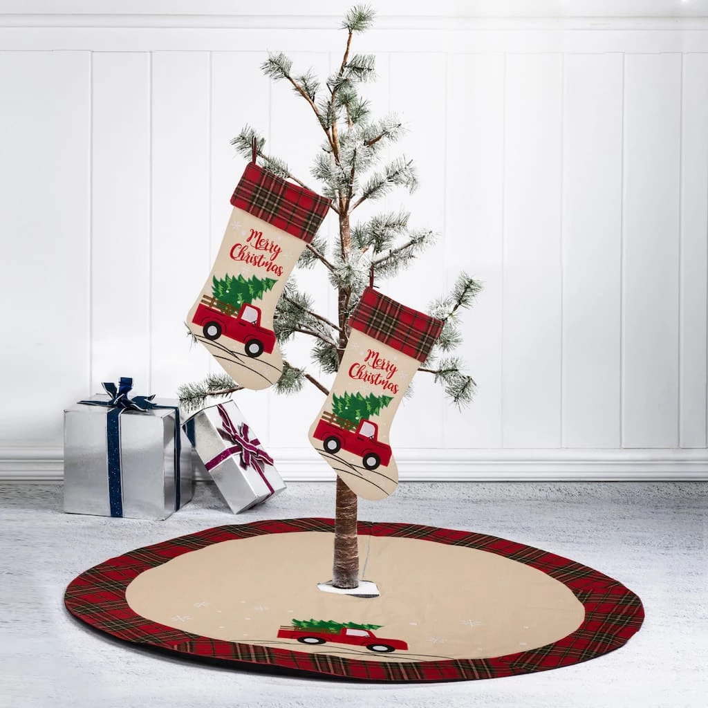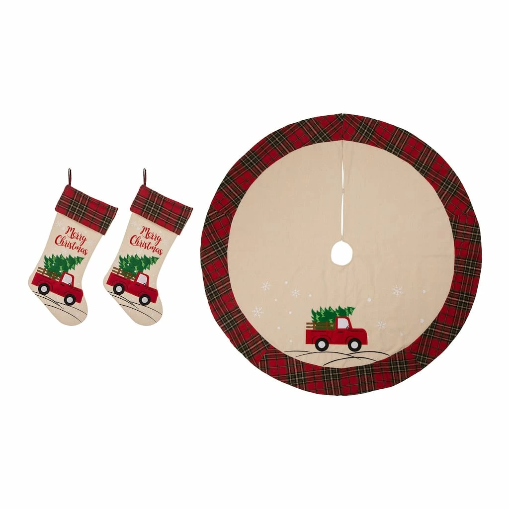 Decorate your home for Christmas with these matching stockings and tree skirt. Hang the stockings on your Christmas tree or fireplace mantel and use the tree skirt under your tree for a pretty addition to your dΓ©cor.