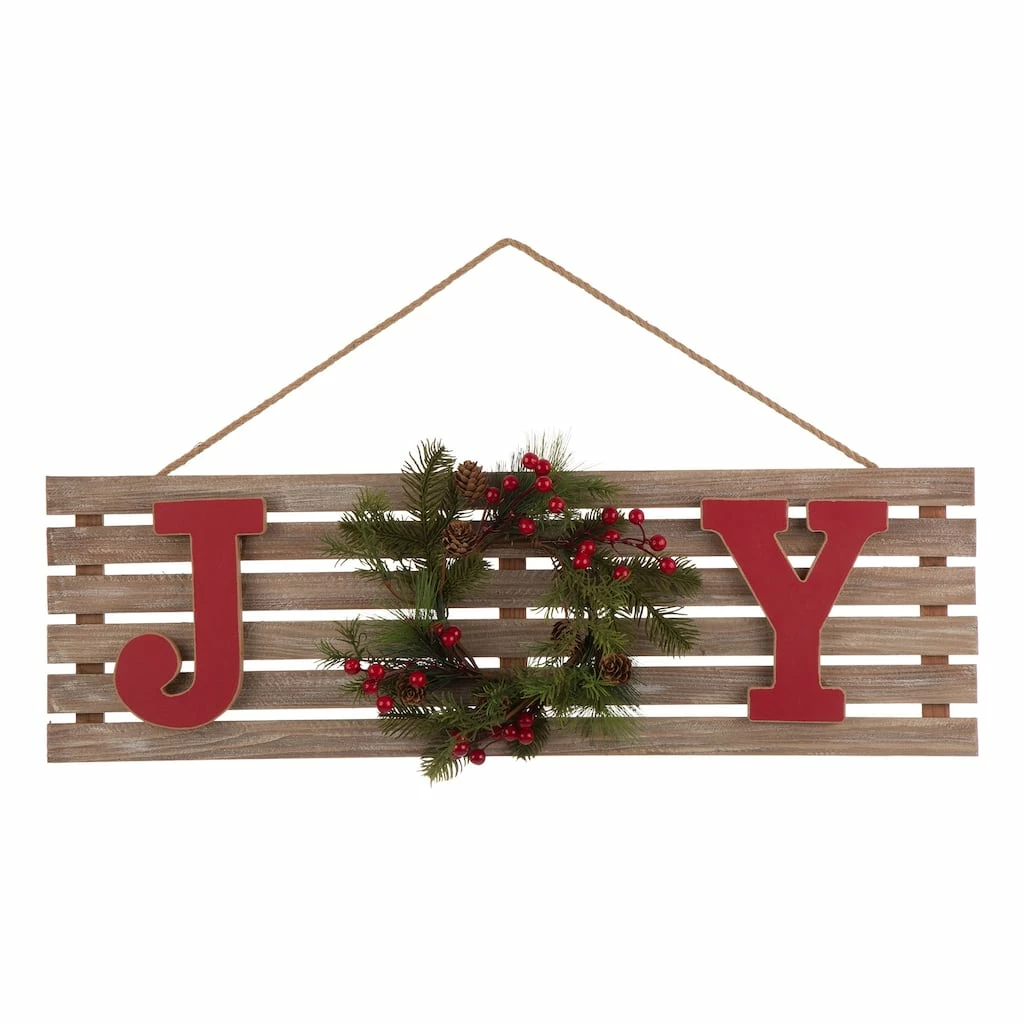 Decorate your home this holiday season with this pretty “Joy” wall dΓ©cor sign. Simply hang it on your front door or living room wall for a festive touch.