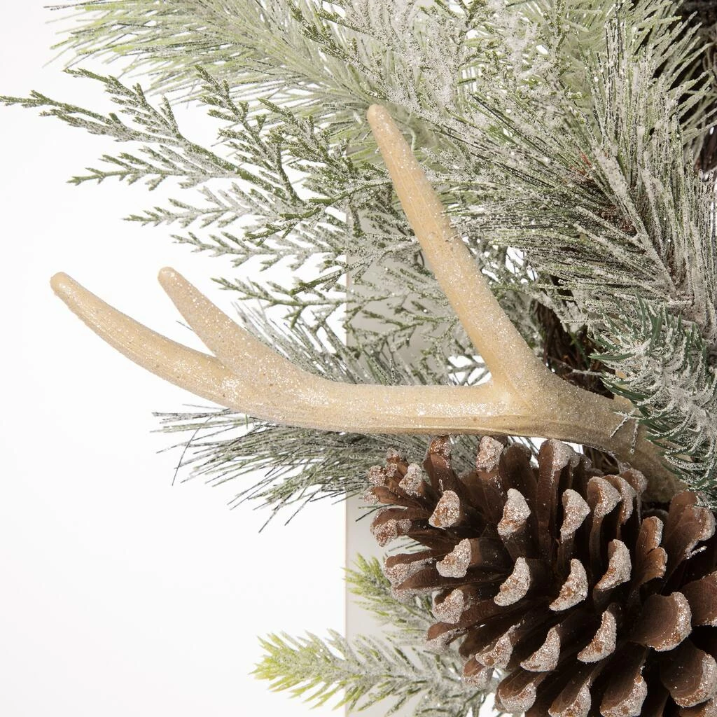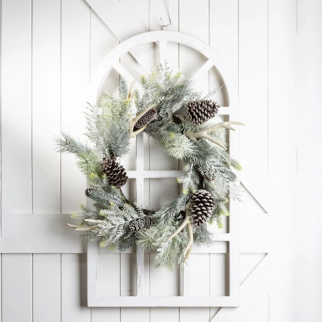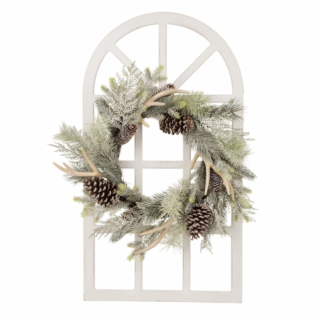 Decorate your wall with this lovely door-shaped window frame. The accompanying wreath will add rustic holiday cheer to your dΓ©cor with pinecones and antlers.