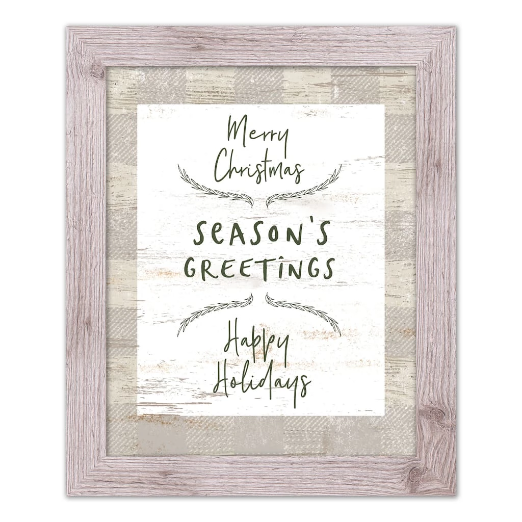 - Gray and cream buffalo check border with green and white print in white woodgrain frame