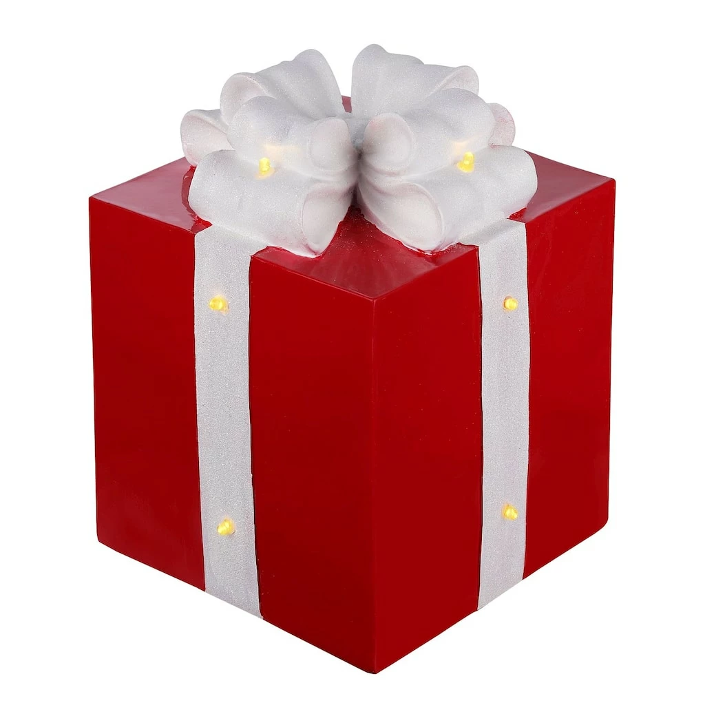 This LED resin Christmas present will make the perfect addition to your holiday scene. Perfectly sized for placing under a Christmas tree, on a tabletop, hearth, bookcase, or mantel. Each present has 12 warm white LEDβs that are battery operated using 3 AAA batteries (not included). The light function also features a built-in timer function that countdowns down when activated and runs 6 hours on/18 hours off.