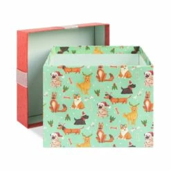 Featuring an adorable design of dogs in holiday-themed accessories, this charming box is a fantastic way to dress up your holiday presents with festive flair. With a pretty mesh bow and coordinating tag, use for decorating under the tree or to hold a special gift sure to stand out as you celebrate the Christmas season with your loved ones.