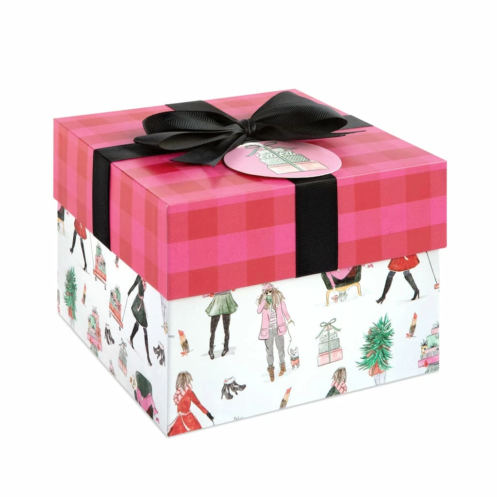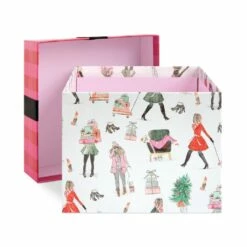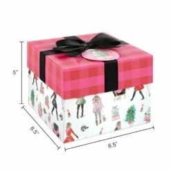 Featuring a fun design of fashionistas enjoying the holidays, this charming box is a fantastic way to dress up your holiday presents with festive flair. With a pretty satin bow and coordinating tag, use for decorating under the tree or to hold a special gift sure to stand out as you celebrate the Christmas season with your loved ones.