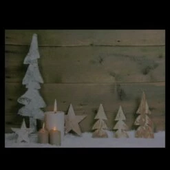 Simple and elegant this wintry scene brings the outdoors in. Featuring 3 candles among carved wooden trees lending a rustic chic feel to any dΓ©cor. Note: Item does not come with a battery cover – open design holds the batteries snugly