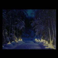 Depicts a nighttime winter scene in the woods and a pathway lined with candles. Candles are illuminated from behind the canvas by 8 yellow LED lights.