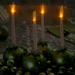 An elegant Christmas centerpiece of pure white candles resting on top of a bed of ornaments sets the tone among the coordinating linens and crystal glasses. 4 flickering amber colored LED lights give the illusion of candlelight. Convenient on/off switch on the side.