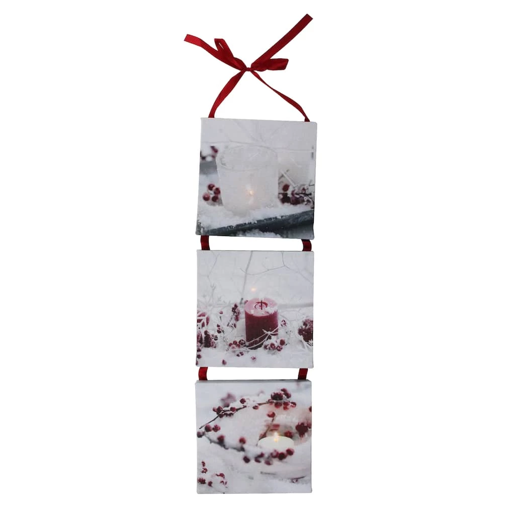 Get in the holiday spirit with this lighted Christmas wall art. Features 3-panels with red frosted holly berries surrounding holiday candles with lighted flames.